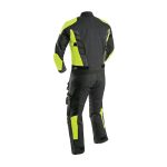 Safety is a priority, with high-visibility textile suit panels in neon colors strategically placed on shoulders, arms, and legs. These enhance visibility in low-light conditions, making them ideal for night riding, industrial work, or emergency response. Reinforced zones at the shoulders, elbows, knees, and back provide added durability and impact protection, while anti-slip textile suit closures (zippers, Velcro, and snap buttons) ensure a secure fit.